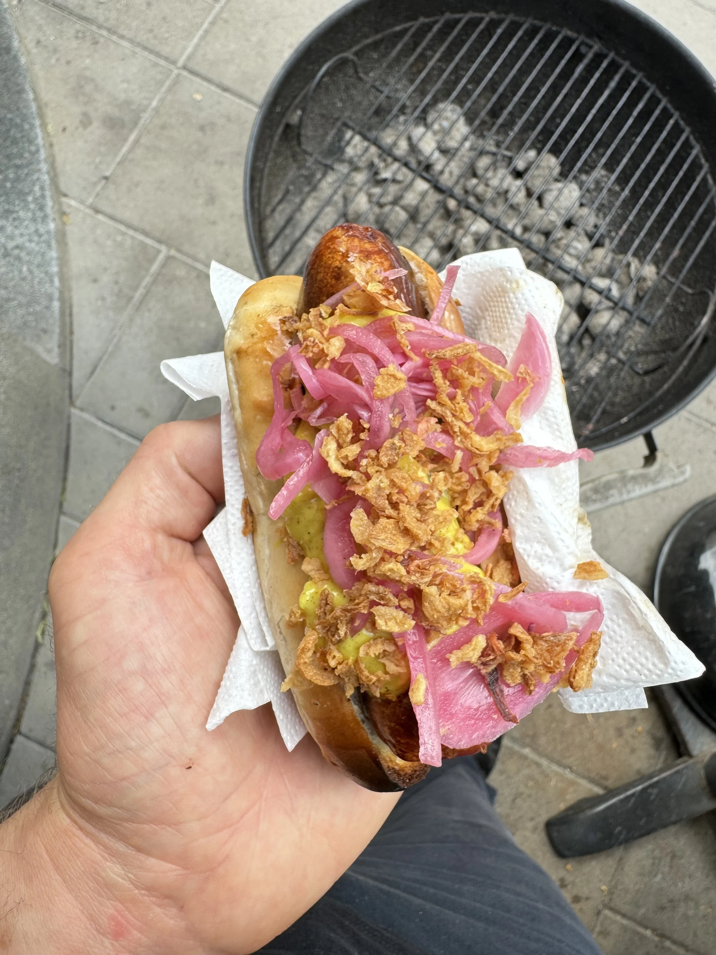 with ketchup, remoulade and crispy fried onions